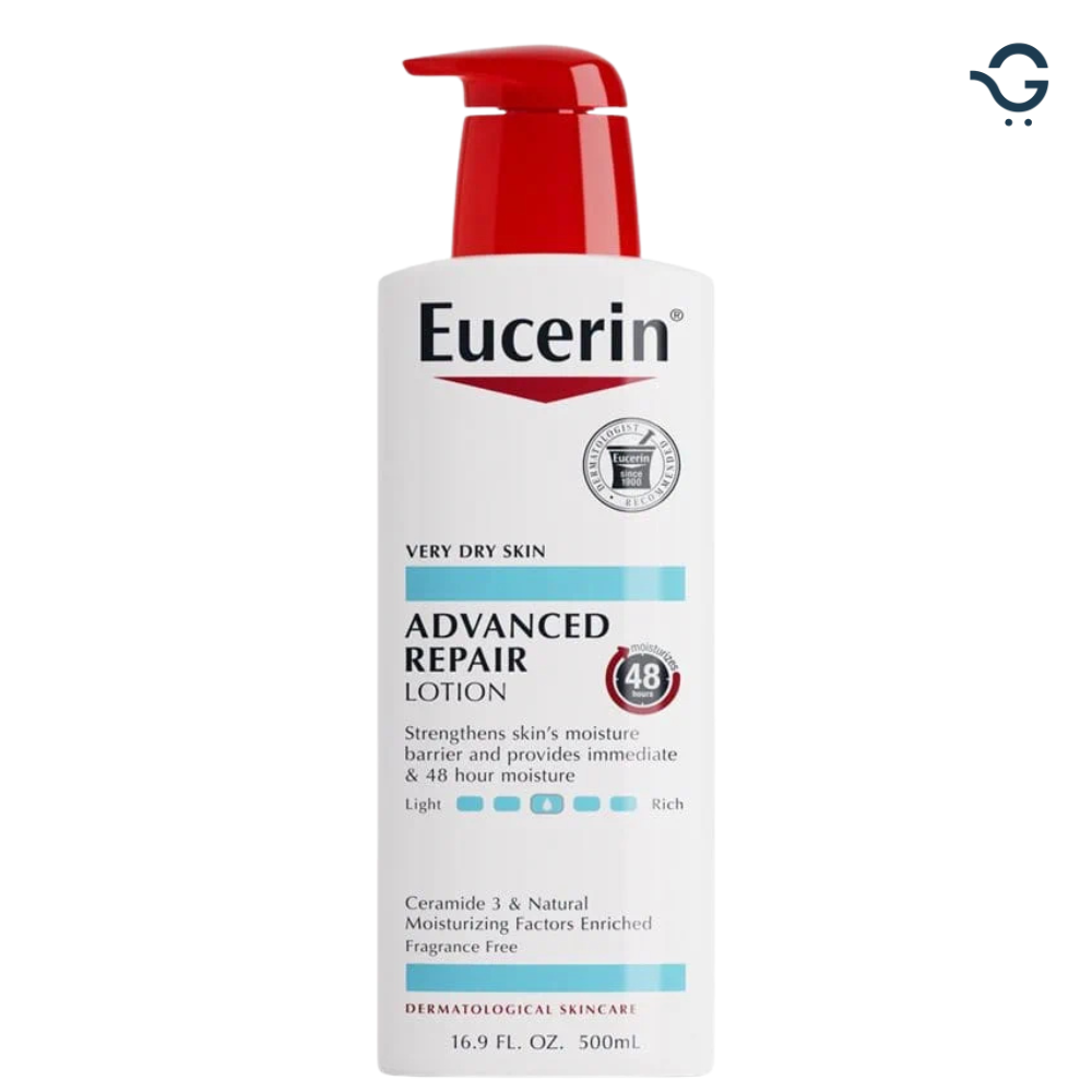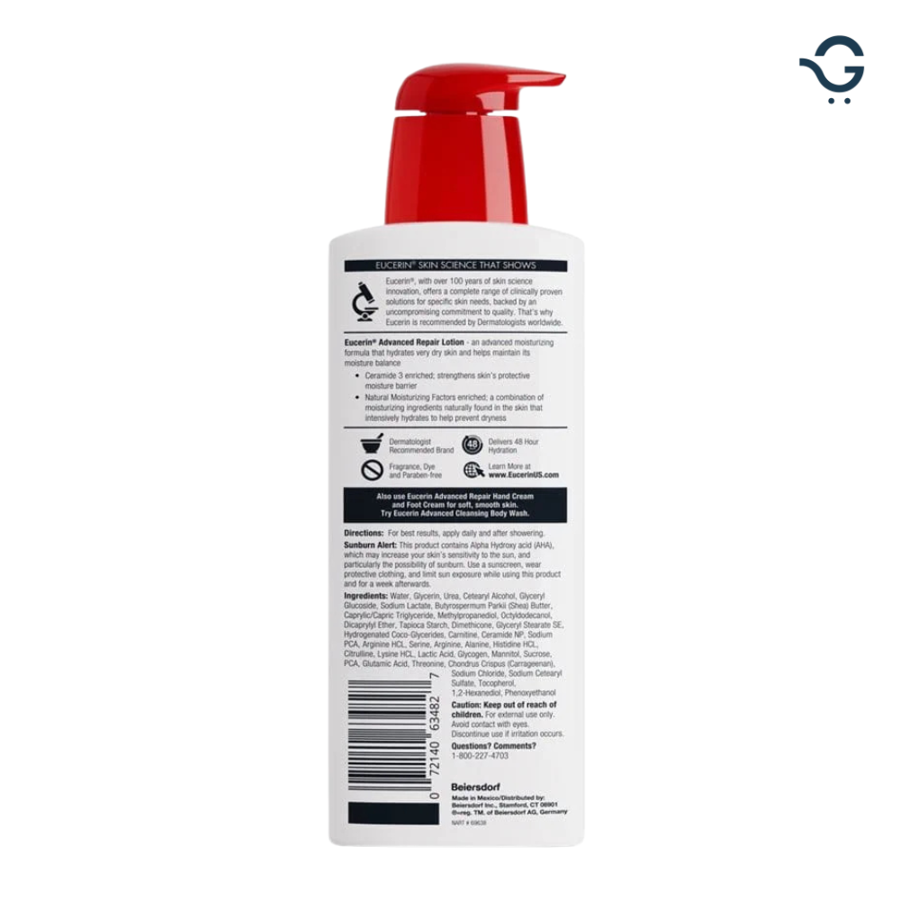 Dermatologists prescribe Eucerin Advanced Repair Lotion, a body moisturizer designed to deeply hydrate extremely dry and rough skin. Ceramide-3 and Natural Moisturizing Factors (NMFs) are added to its sophisticated composition to help seal in moisture, strengthen the skin’s natural moisture barrier, and provide up to 48 hours of continuous moisture for smoother, healthier-looking skin.